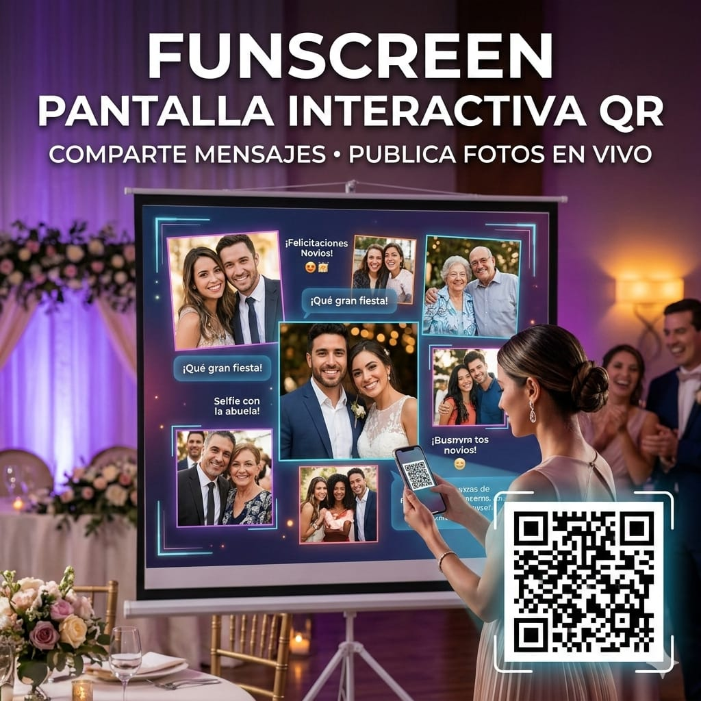 📸 Interacción en Vivo: Los invitados escanean un código QR desde sus mesas (sin descargar apps) y envían sus fotos y mensajes divertidos en tiempo real.