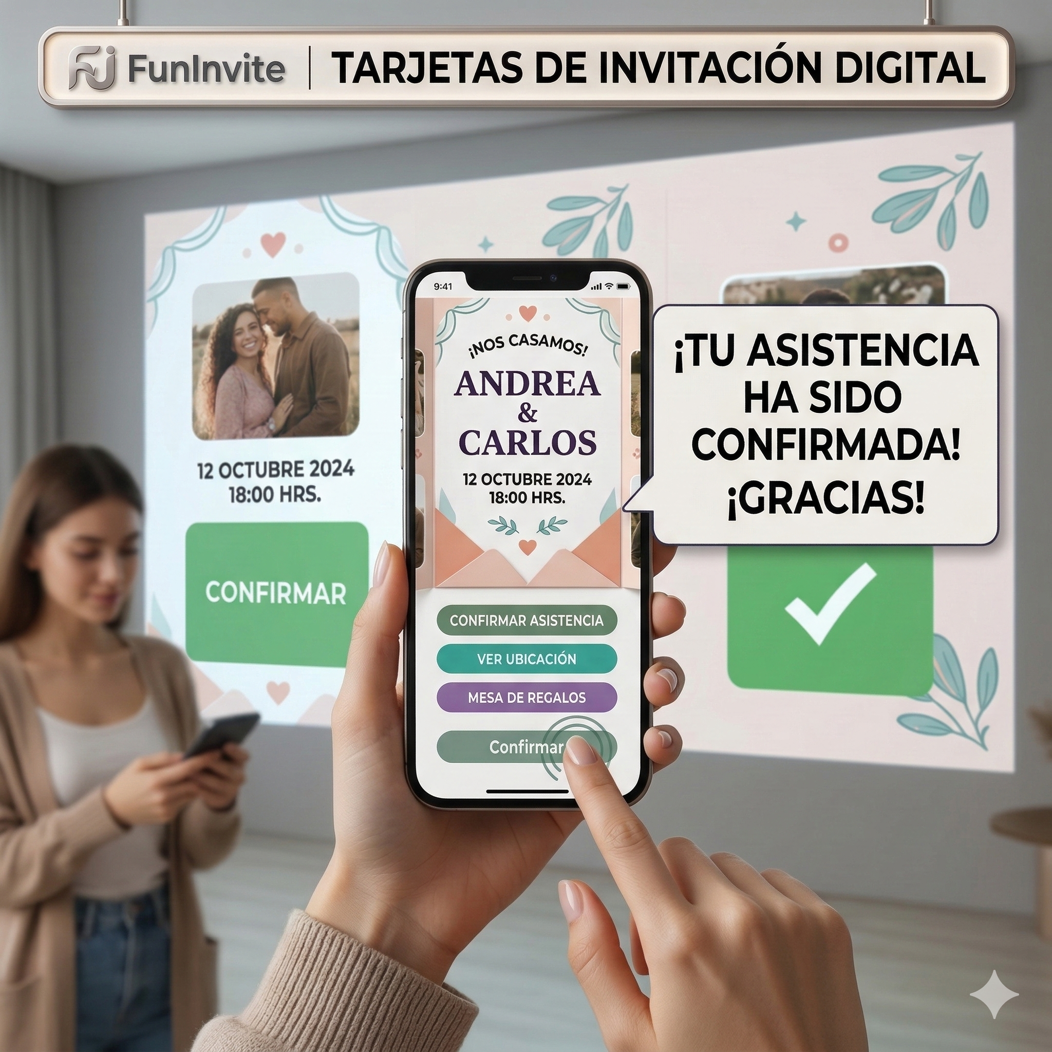 Transforma la forma de invitar con FunInvite. Elegancia digital con mapas integrados, mesa de regalos y confirmación de asistencia automática para que tú solo te preocupes por disfrutar.